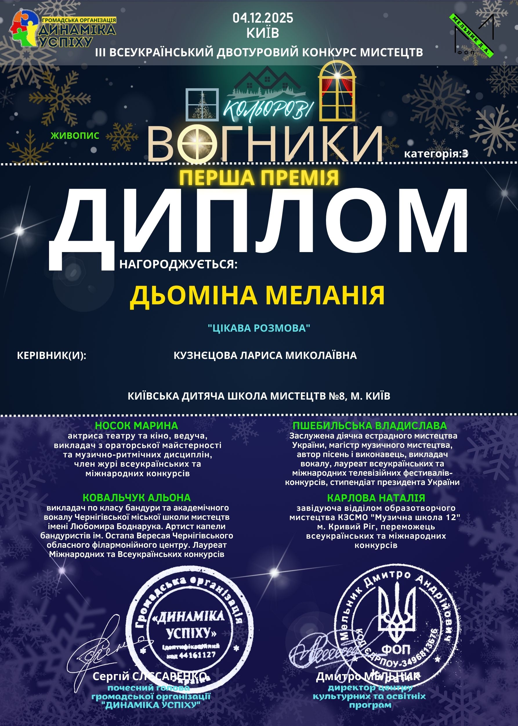 Окрема подяка й щирі вітання викладачці Ларисі Кузнєцовій, чия професійна майстерність, творче бачення та натхненна педагогічна праця допомагають юним художникам розкривати свій талант і досягати високих результатів.