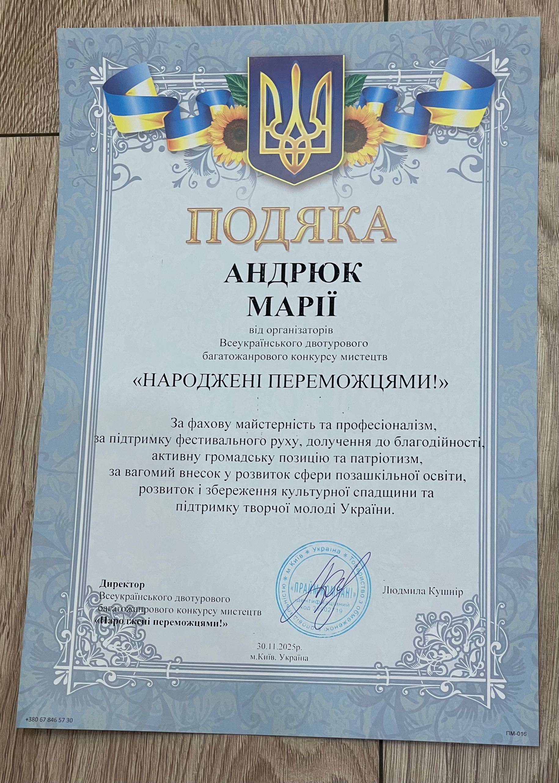 Щира подяка викладачці Марії Андрюк за невтомну підтримку, професійну майстерність і турботу, яка допомагає розкривати юні голоси й вести їх до нових вершин.