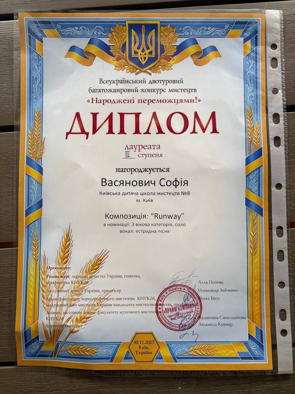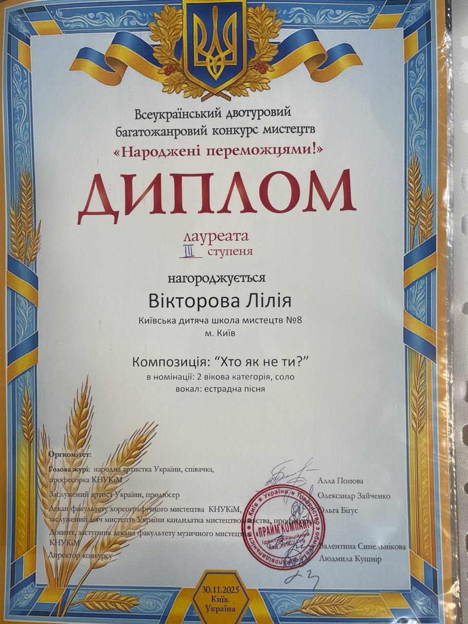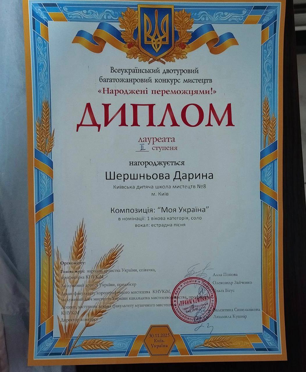 На Всеукраїнському двотуровому багатожанровому конкурсі мистецтв «Народжені переможцями», що відбувся 30 листопада в Центрі культури і мистецтв КНЕУ ім. В. Гетьмана, учениці класу естрадного вокалу, викладачка Марія Андрюк, здобули яскраві перемоги та звання лауреатів у різних вікових категоріях: