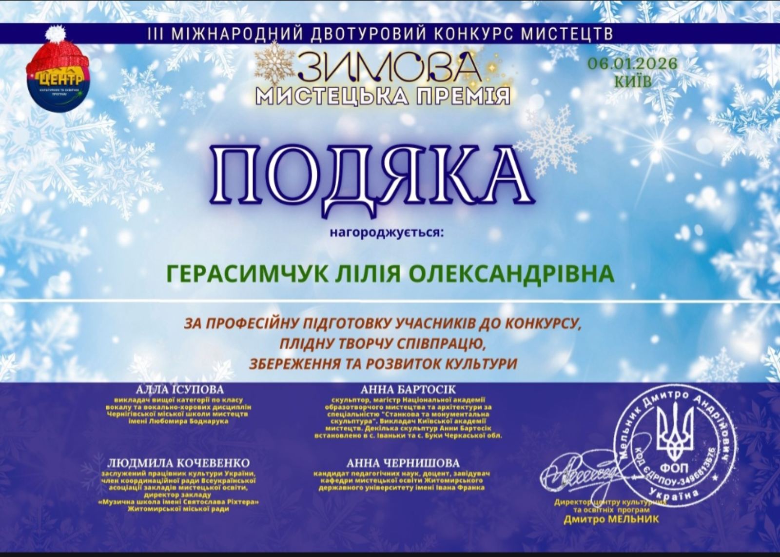 Ця нагорода — результат великої праці, наполегливості та щирої любові до мистецтва. Особлива вдячність викладачці Лілії Олександрівні Герасимчук за високу професійну майстерність, відданість справі та вміння розкривати найкращі грані дитячого таланту. Саме під її чуйним керівництвом Христина змогла майстерно виконати конкурсну програму та отримати високу оцінку професійного журі.