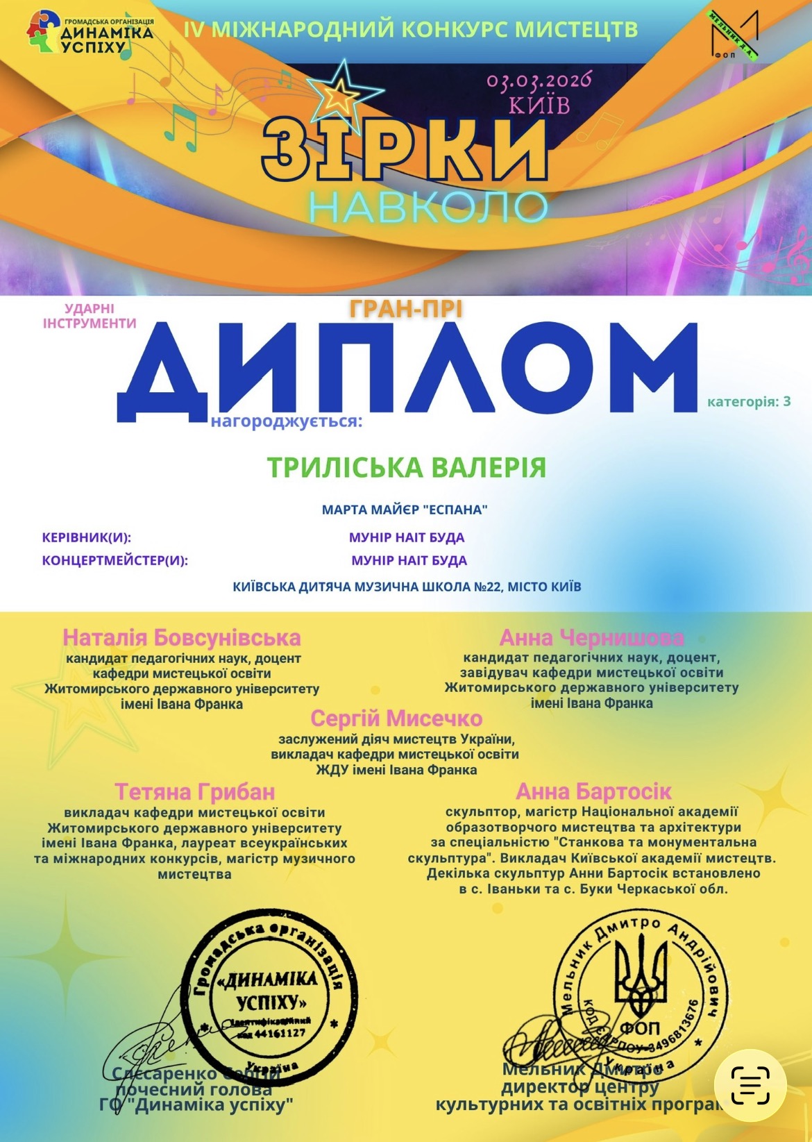 Вітаємо ученицю КДМШ № 22 Валерію Триліську з чудовою перемогою на Міжнародному конкурсі «ЗІРКИ НАВКОЛО»
