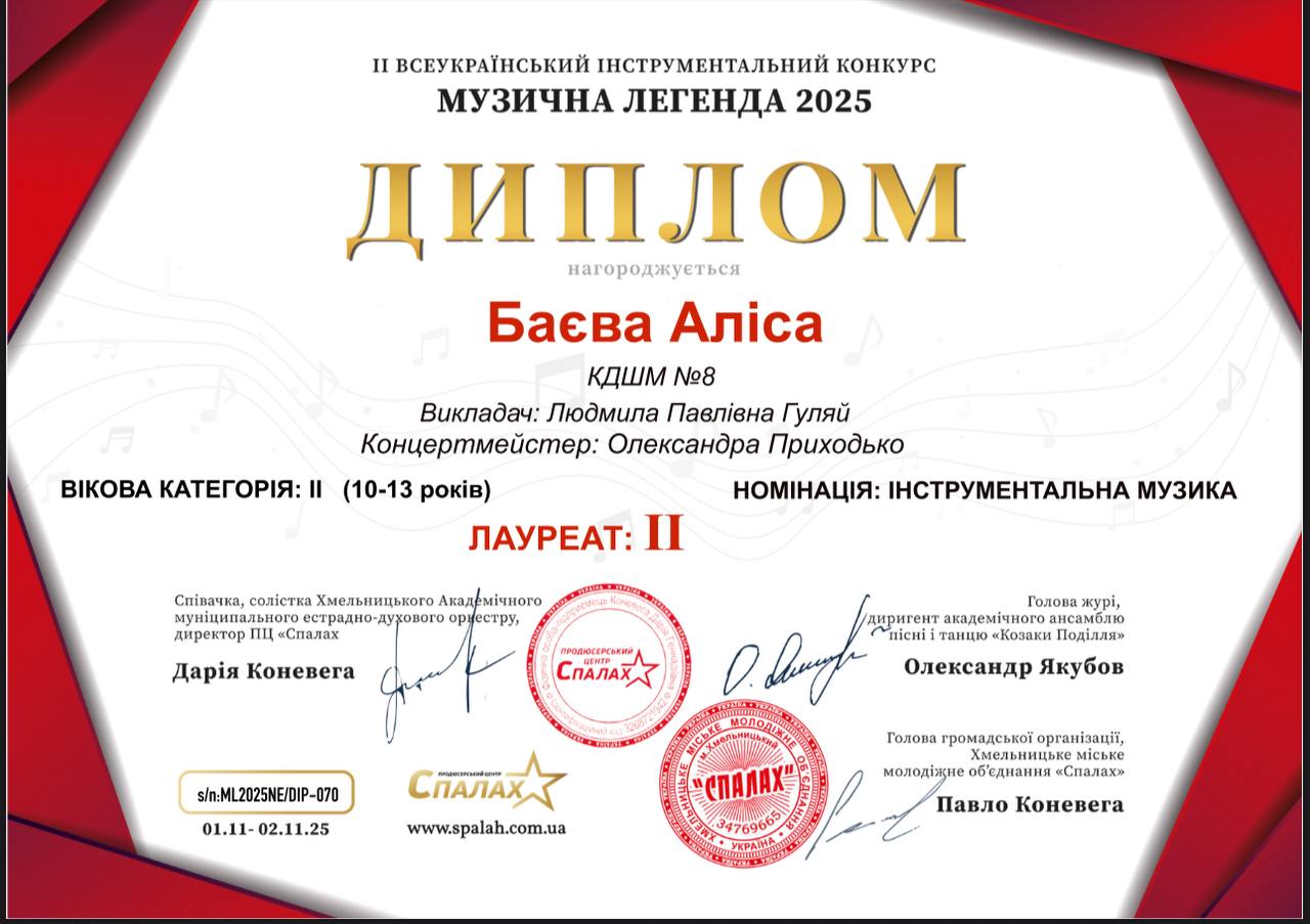 Вітаємо ученицю КДШМ № 8 Алісу Баєву з творчою перемогою на II Всеукраїнському інструментальному конкурсі «Музична легенда – 2025»!