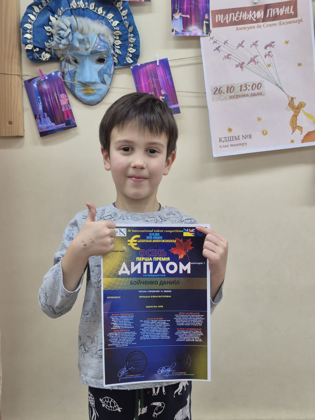 Учень Київської дитячої школи мистецтв № 8 Бойченко Даниїл, клас театрального мистецтва, викладачка Олена Зброцька отримав I премію на IV Міжнародному конкурсі талантів “Євро Осінь”