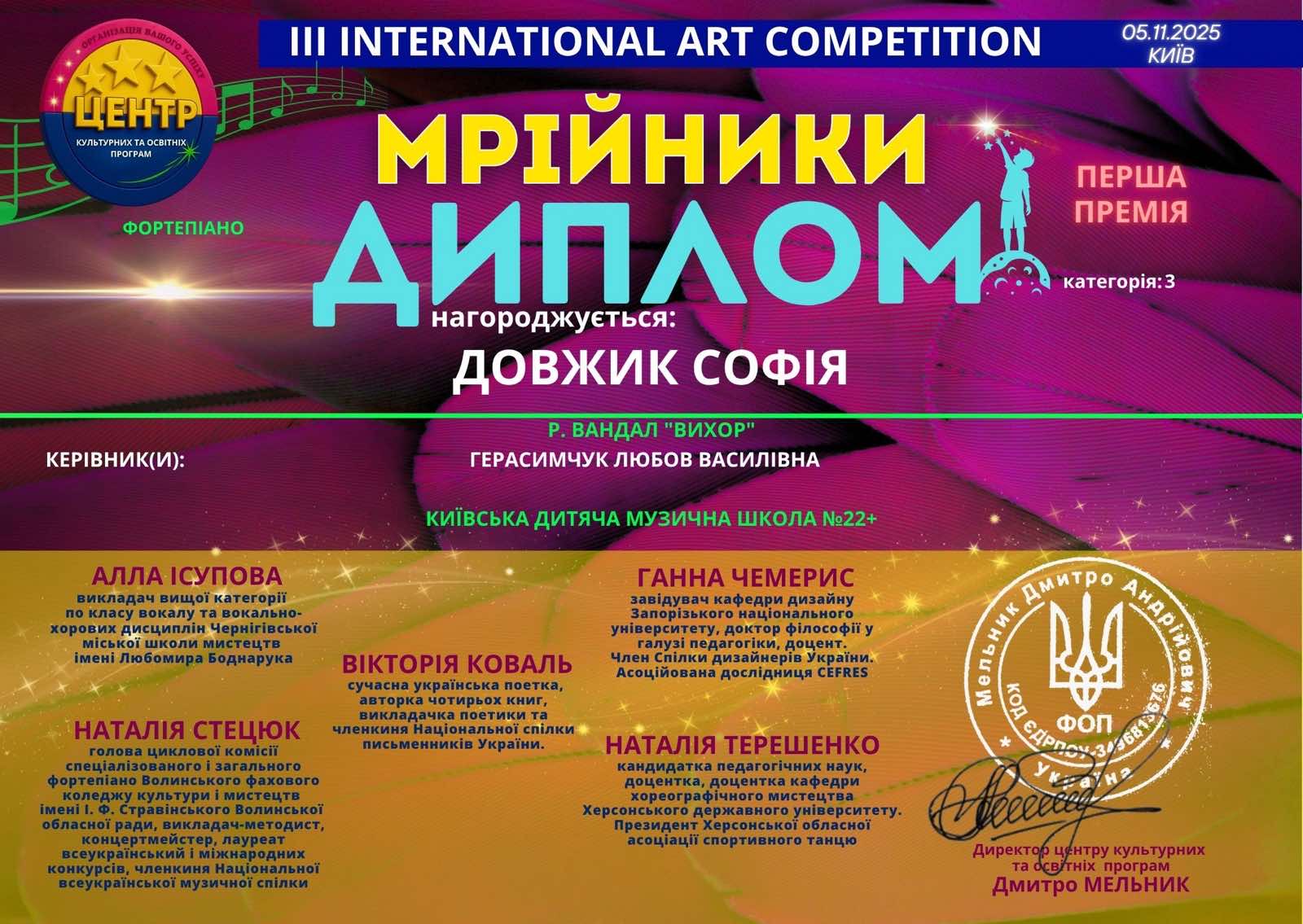 Учениця Київської дитячої музичної школи № 22 Софія Довжик (викладачка Любов Герасимчук) здобула Першу премію на III International Art Competition «МРІЙНИКИ» у Києві