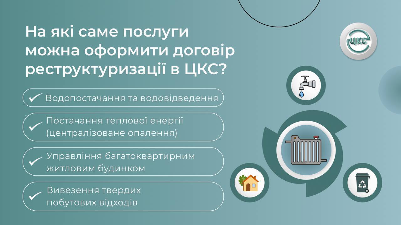 Комунальний концерн «Центр комунального сервісу» (ЦКС) інформує: в разі виникнення заборгованості за житлово-комунальні послуги споживачам варто оформити договір реструктуризації заборгованості. Він дає можливість погашати накопичений борг частинами. Умови реструктуризації враховують у кожному окремому випадку фінансову спроможність боржника, тому ефективність цього механізму доведена на практиці.
