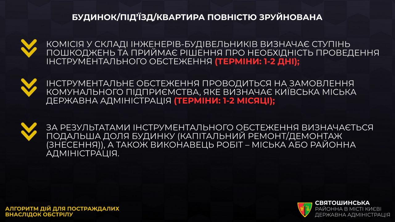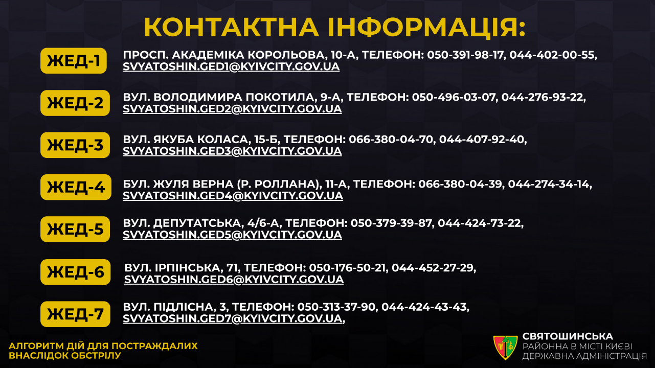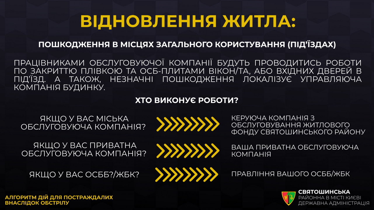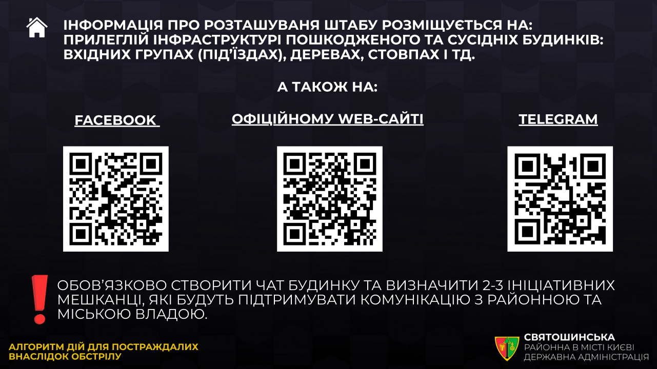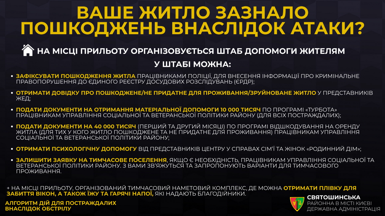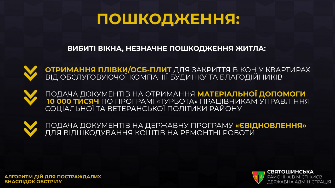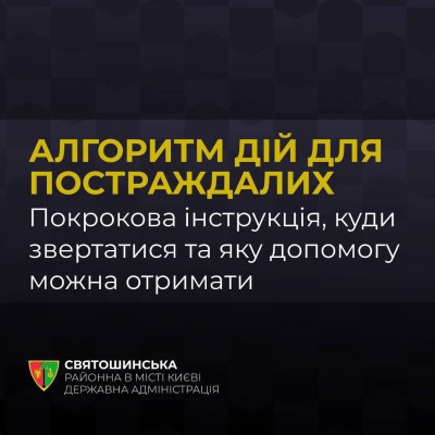 Святошинська районна в місті Києві державна адміністрація підготувала алгоритм дій для постраждалих мешканців Святошинського району.