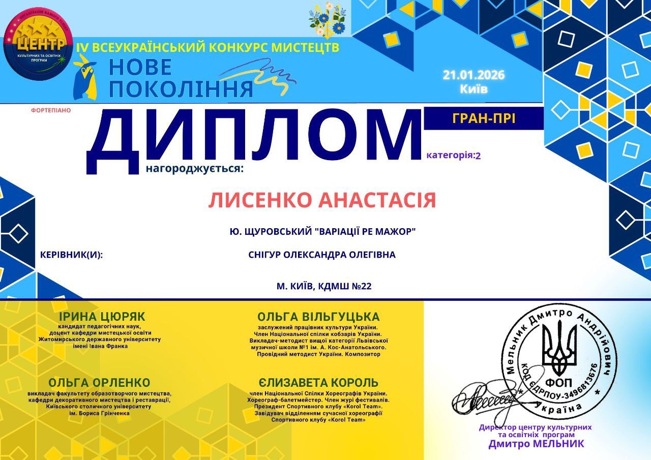Лисенко Анастасія, учениця Київської дитячої музичної школи № 22, здобула ГРАН-ПРІ на IV Всеукраїнському конкурсі мистецтв «Нове покоління» у номінації «фортепіано».