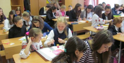 На другому уроці було проведено флешмоб “Намалюй Україну”. І кожна паралель обирала свою квітку. Очима дітей Україна постала синіми волошками, ніжними дзвіночками, ромашкою і мальвами, червоним маком і золотим соняхом, блакитним барвінком і оксамитовими чорнобривцями. А потім до складеного віночка в’язали кольорові стрічки, і кожна мала своє призначення, як і у дівочому вінку.