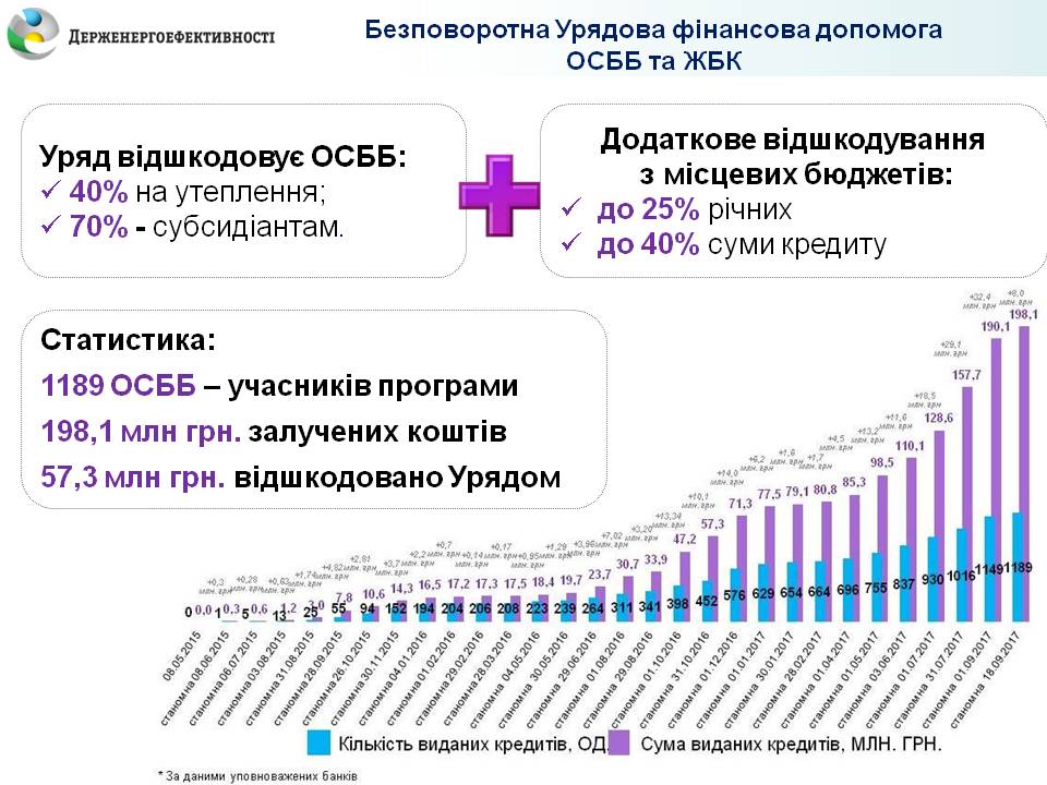 За 8,5 місяців поточного року ОСББ та ЖБК взяли в державних банках 560 «теплих кредитів» на суму 120 млн гривень. Це у 2 рази більше ніж за весь 2016 рік, коли ОСББ отримали 435 кредитів на суму 61 млн гривень.