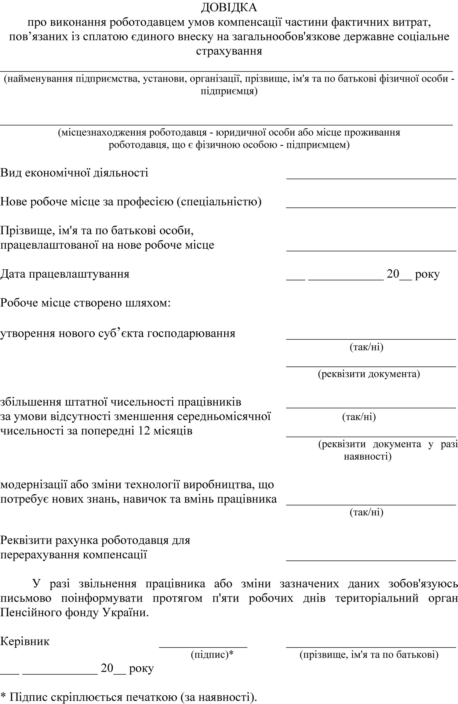 Для отримання компенсації роботодавець протягом 12 місяців з дня укладення трудового договору з особою, працевлаштованою на нове робоче місце, подає органові Пенсійного фонду України, в якому він перебуває на обліку як платник внесків, довідку про виконання роботодавцем умов компенсації частини фактичних витрат, пов’язаних із сплатою єдиного внеску на загальнообов’язкове державне соціальне страхування, за формою згідно з додатком.