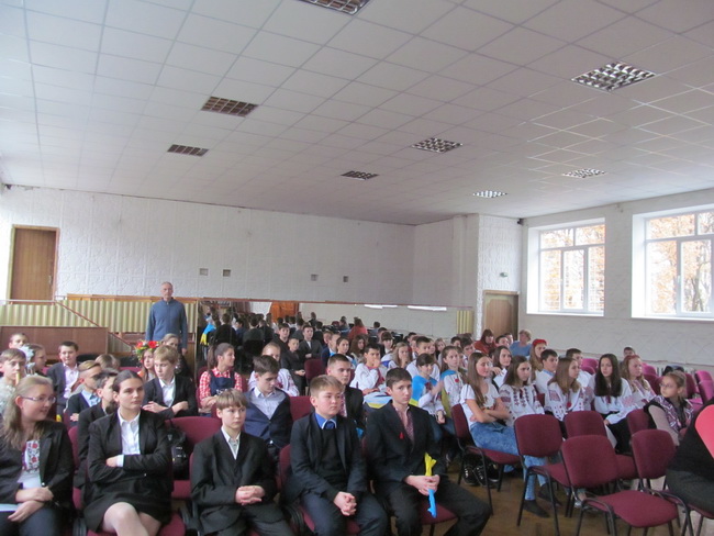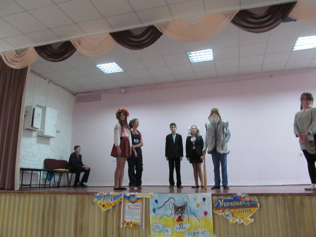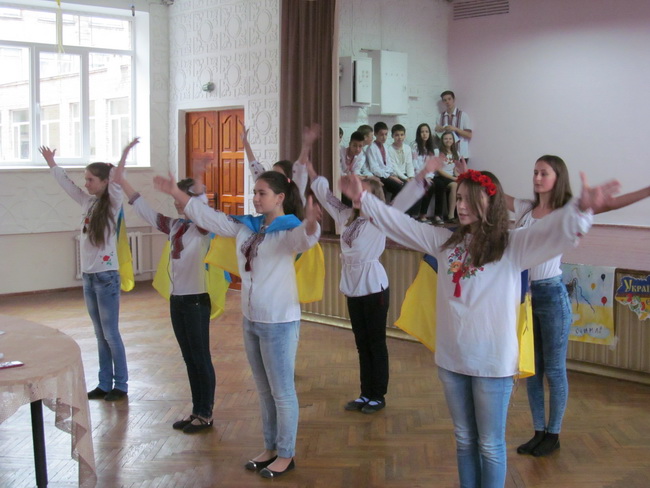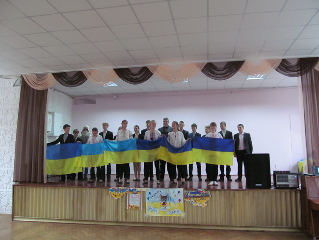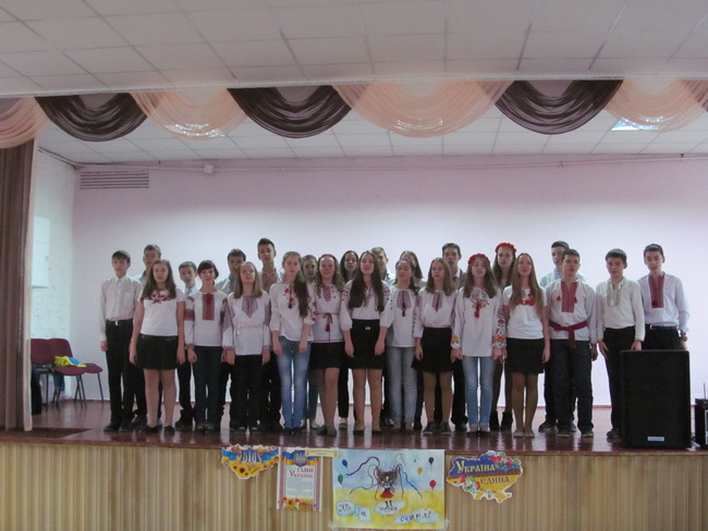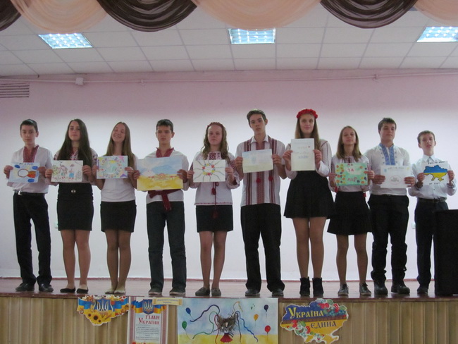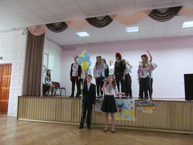 Чудові рядки любові та вдячності рідній землі – Україні, слова звеличення героям боїв за Україну – так розпочали свій виступ учні 8-А класу (класний керівник - Ковалевська Л.В.). І міцно-міцно переплелися у їх виступі почуття патріотизму і скорботи з ніжністю та любов’ю до матері – України. Як горді діти волелюбного народу, співали учні 8-А класу патріотичну пісню, влаштували яскравий флешмоб.