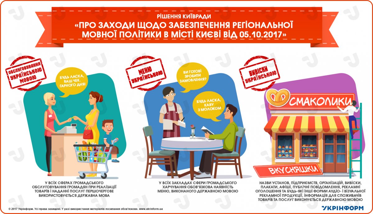 Відповідно до рішення Київської міської ради з 05.10.2017 №166/3173 «Про заходи щодо забезпечення регіональної мовної політики» в м. Києві, прийнято норми, що передбачають низку концептуальних ініціатив у частині регулювання діяльності суб’єктів господарської діяльності. Так, Київська міська рада чітко визначила, що рекламні оголошення, вивіски, плакати, афіші, повідомлення та інші форми аудіо- і візуальної рекламної продукції повинні виконуватись українською або іншою мовою з обов’язковим зазначення їх перекладу чи транслітерації інформації про товари та послуги та для належного обслуговування споживачів.
