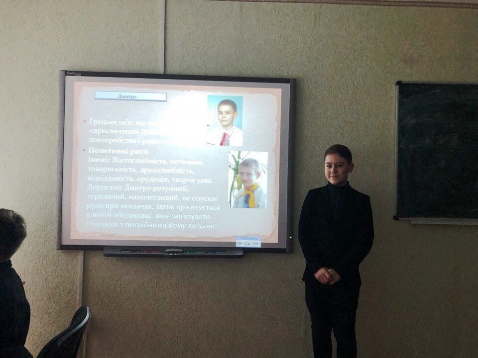 1. Бесіда«Ти і твоє ім’я», під час якої учні 6-А класу разом із класним керівником Орлянською В.Г. дослідили походження власних імен, їх історію та значення. Презентація до бесіди була підготовлена Буханевичем А.